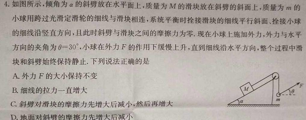 4.如图所示,倾角为α的斜劈放在水平面上,质量为M的滑块放在斜劈的斜面上,质量为m的小球用跨过光滑定滑轮的细线与滑块相连,系统平衡时拴接滑块的细线平行斜面、拴接小球的细线沿竖直方向,且此时斜劈与滑块之间的摩擦力为零.现在小球上施加外力,外力与水平方向的夹角为=30^,,小球在外力F的作用下缓慢上升,直到细线沿水平方向,整个过程中滑块和斜劈始终保持静止.下列说法正确的是A.外力F的大小保持不变B.细线的拉力一直增大C.斜劈对滑块的摩擦力先增大后减小,然后再增大D.地面对斜劈的摩擦力先增大后减小
