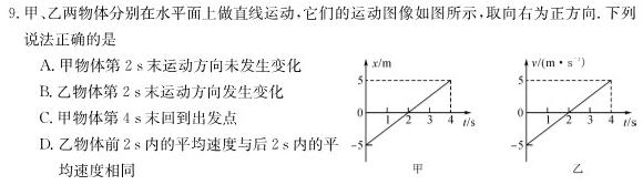 9.甲、乙两物体分别在水平面上做直线运动,它们的运动图像如图所示,取向右为正方向.下列说法正确的是A.甲物体第2s末运动方向未发生变化B.乙物体第2s末运动方向发生变化C.甲物体第4s末回到出发点D.乙物体前2s内的平均速度与后2s内的平均速度相同