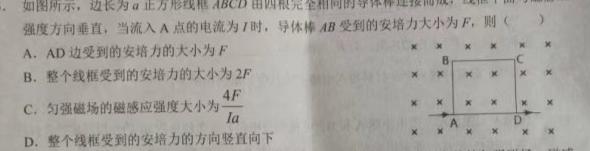 5.如图所示,边长为a正方形线框ABCD由四根完全相同的导体棒连接而成,线框平面与磁感应强度方向垂直,当流入A点的电流为7时,导体棒A受到的安培力大小为F,则()A.AD边受到的安培力的大小为FB.整个线框受到的安培力的大小为2FC.匀强磁场的磁感应强度大小为4FlaD.整个线框受到的安培力的方向竖直向下BADxxx