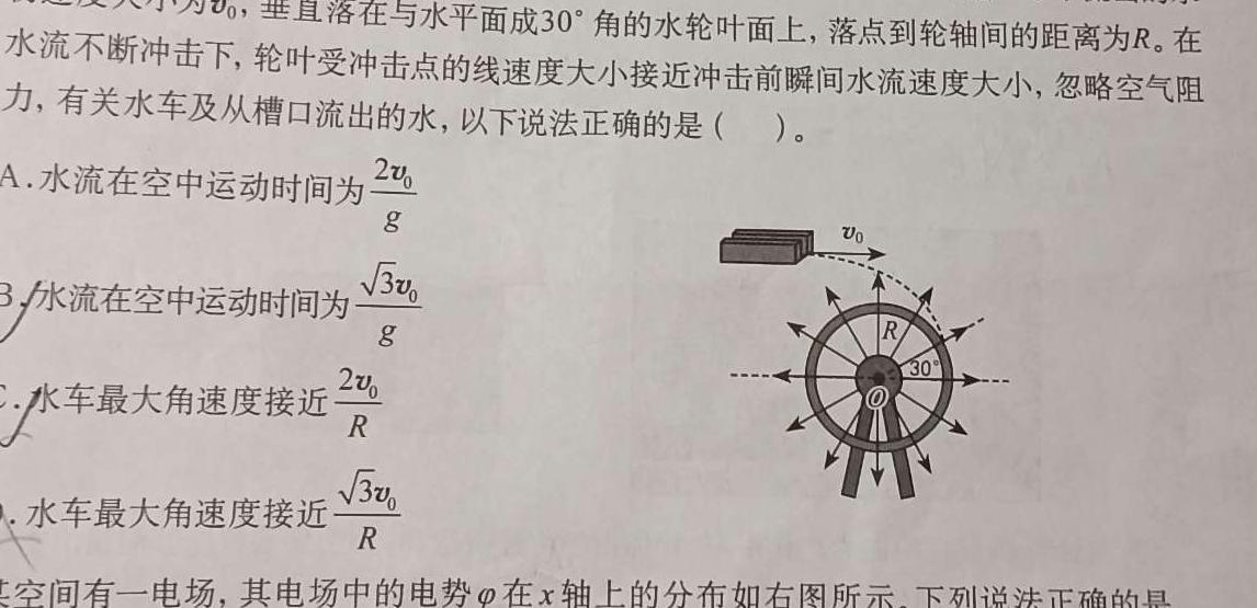 6.水车是我国劳动人民利用水能的一项重要发明。右图为某水车模型,从槽口水平流出的水初速度大小为v0,,垂直落在与水平面成30^角的水轮叶面上,落点到轮轴间的距离为R。在水流不断冲击下,轮叶受冲击点的线速度大小接近冲击前瞬间水流速度大小,忽略空气阻力,有关水车及从槽口流出的水,以下说法正确的是()。A.水流在空中运动时间为2v0gB.水流在空中运动时间为3v0gC.水车最大角速度接近2v0RD.水车最大角速度接近3v0R