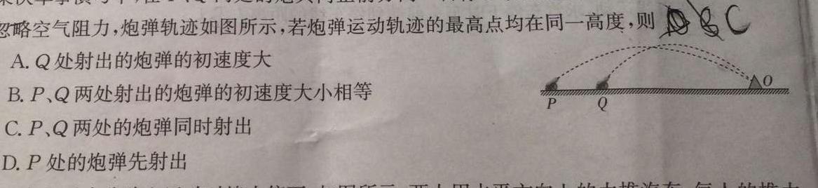 8.某次军事演习中,在P、Q两处的炮兵向正前方同一目标O发射炮弹,要求同时击中目标忽略空气阻力,炮弹轨迹如图所示,若炮弹运动轨迹的最高点均在同一高度,则CA.Q处射出的炮弹的初速度大B.P、Q两处射出的炮弹的初速度大小相等C.P、Q两处的炮弹同时射出D.P处的炮弹先射出PQ