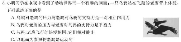 8.小明同学在电视中看到了动物世界里一个有趣的画面:一只乌鸦站在飞翔的老鹰背上休憩,下列说法正确的是A.乌鸦对老鹰的压力与老鹰对乌鸦的支持力是一对相互作用力B.乌鸦对老鹰的压力与老鹰对乌鸦的支持力是平衡力C.乌鸦、老鹰飞行的快慢相同,它们相对静止D.以地面为参照物老鹰是运动的