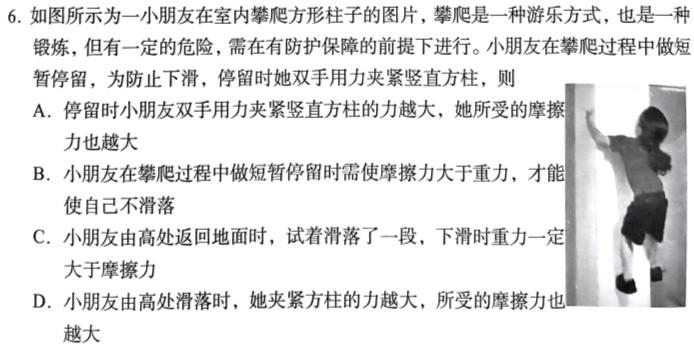 6.如图所示为一小朋友在室内攀爬方形柱子的图片,攀爬是一种游乐方式,也是一种锻炼,但有一定的危险,需在有防护保障的前提下进行。小朋友在攀爬过程中做短暂停留,为防止下滑,停留时她双手用力夹紧竖直方柱,则A.停留时小朋友双手用力夹紧竖直方柱的力越大,她所受的摩擦力也越大B.小朋友在攀爬过程中做短暂停留时需使摩擦力大于重力,才能使自己不滑落C.小朋友由高处返回地面时,试着滑落了一段,下滑时重力一定大于摩擦力D.小朋友由高处滑落时,她夹紧方柱的力越大,所受的摩擦力也越大