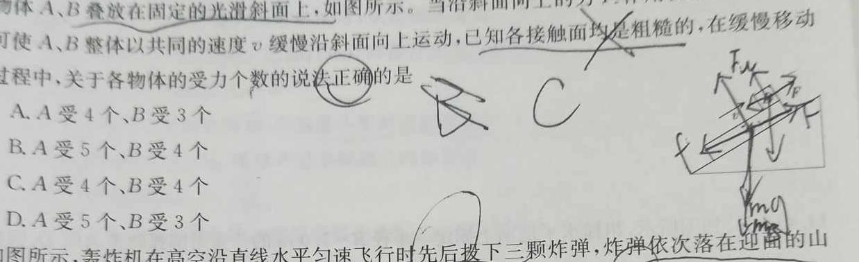 4.物体A、B叠放在固定的光滑斜面上,如图所示。当沿斜面向上的力F作用在物体B上时,F.可使A、B整体以共同的速度v缓慢沿斜面向上运动,已知各接触面均是粗糙的,在缓慢移动过程中,关于各物体的受力个数的说法正确的是A.A受4个、B受3个B.A受5个、B受4个C.A受4个、B受4个D.A受5个、B受3个Cpmo