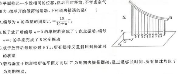 阻力,摆球开始做简谐运动,下列说法错误的是()A.编号为n的单摆的周期T.在平面推起一小段相同的位移,然后同时释放,不考虑空气=1010+nT。B.板子放开后编号n=0的单摆若完成了5次全振动,编号n=6的单摆完成了8次全振动C.板子放开后最短经过9T0,所有摆球又重新回到释放时的状态D.若沿垂直于蛇形摆所在平面方向以T为周期去摇晃摆架,经过足够长时间,所有摆球均以T为周期摆动。
