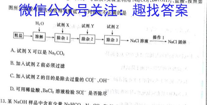 12.粗盐溶液中常含有Ca^2+、Mg^2+、SO4^2-等杂质,实验室利用Na2CO3、Ba(OH)2、盐酸,按照如图所示流程可除去杂质得到精盐。下列说法不正确的是操作1NaCl溶液固体A.试剂X可以是Na2CO3B.加入试剂Z前必须过滤C.加入试剂Z的目的是除去过量的CO3^2-、OH^-D.可用稀盐酸、BaCl2溶液检验SO4^2-是否除尽