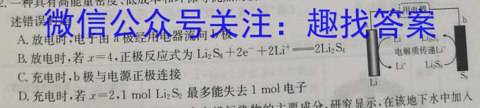 12.一种具有高能量密度、低成本和环保等优点的新型二次电池如图(x可为2、4、6、8)。下列叙述错误的是A.放电时,电子由a极经用电器流向b极B.放电时,若x=4,正极反应式为Li2S8+2e^-+2Li^+2Li2S4C.充电时,b极与电源正极连接D.充电时,若x=2,1molLi2S2最多能失去1mol电子