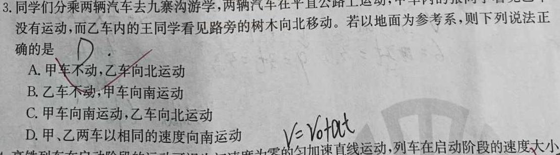 3.同学们分乘两辆汽车去九寨沟游学,两辆汽车在平直公路上运动,甲车内的张同学看见乙车没有运动,而乙车内的王同学看见路旁的树木向北移动。若以地面为参考系,则下列说法正确的是DA.甲车不动,乙车向北运动B.乙车不动,甲车向南运动C.甲车向南运动,乙车向北运动D.甲、乙两车以相同的速度向南运动V=vo+at