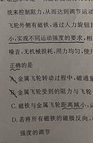6.动感单车是一项能够使全身得到统来控制阻力,从而达到调节运动飞轮外侧有磁铁,通过人力旋钮小,实现不同运动强度的要求,相噪音,无机械损耗,用力均匀,使用正确的是A.金属飞轮转动过程中,磁通量B.金属飞轮受到的阻力与飞轮C.磁铁与金属飞轮距离减小,D.若将所有磁铁的磁极反向,强度的调节