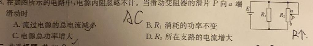 8.在如图所示的电路中,电源内阻忽略不计。当滑动变阻器的滑片P向a端滑动时ACA.流过电源的总电流减小B.R1消耗的功率不变C.电源总功率增大D.R2所在支路的电流增大P个