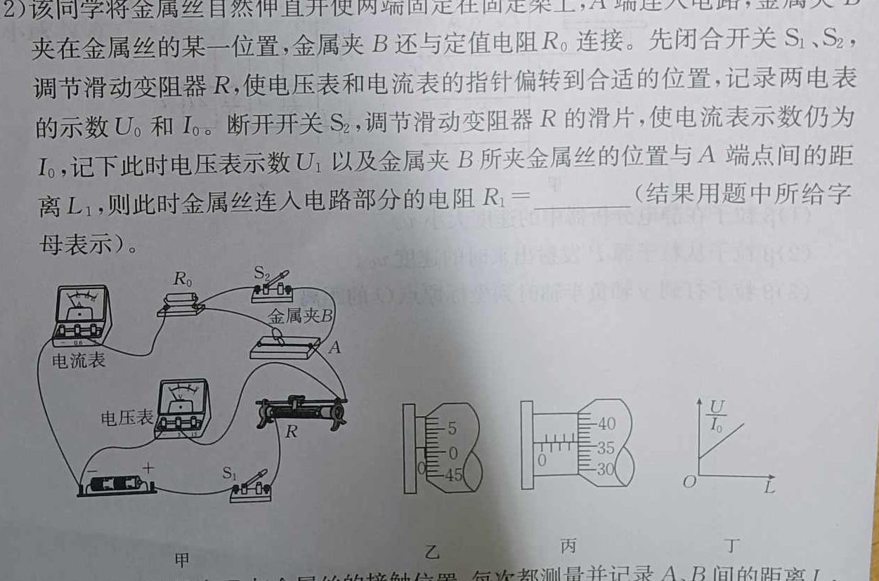 (2)该同学将金属丝自然伸直并使两端固定在固定架上,A端连入电路,金属夹B夹在金属丝的某一位置,金属夹B还与定值电阻R0,连接。先闭合开关S1、S2,调节滑动变阻器R,使电压表和电流表的指针偏转到合适的位置,记录两电表的示数U0和I0。,断开开关S2,调节滑动变阻器R的滑片,使电流表示数仍为I0,记下此时电压表示数U1以及金属夹B所夹金属丝的位置与A端点间的距离L1,则此时金属丝连入电路部分的电阻R1=(结果用题中所给字母表示)。
