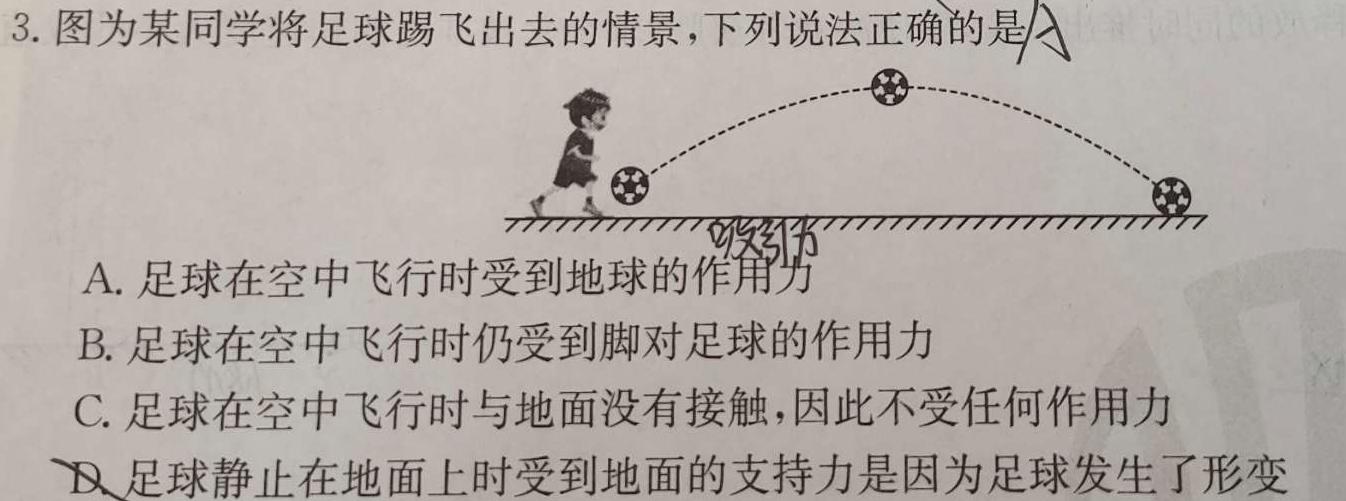 3.图为某同学将足球踢飞出去的情景,下列说法正确的是A.足球在空中飞行时受到地球的作用力B.足球在空中飞行时仍受到脚对足球的作用力C.足球在空中飞行时与地面没有接触,因此不受任何作用力D足球静止在地面上时受到地面的支持力是因为足球发生了形变变