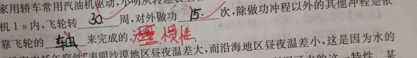 15.家用轿车常用汽油机驱动,小明从转速表上看到发动机的转速为1800min.则发动机1s内,飞轮转30.周,对外做功15.次,除做功冲程以外的其他冲程是依靠飞轮的轴来完成的。惯性