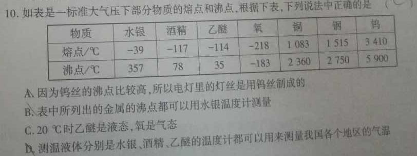 10.如表是一标准大气压下部分物质的熔点和沸点,根据下表,下列说法中正确的是A.因为钨丝的沸点比较高,所以电灯里的灯丝是用钨丝制成的B.表中所列出的金属的沸点都可以用水银温度计测量C.20^C时乙醚是液态,氧是气态D.测温液体分别是水银、酒精、乙醚的温度计都可以用来测量我国各个地区的气温