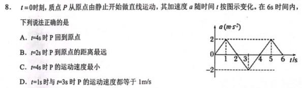 8.t=0时刻,质点P从原点由静止开始做直线运动,其加速度a随时间t按图示变化。在6s时间内,下列说法正确的是A.t=4s时P回到原点B.t=2s时P到原点的距离最远C.t=4s时P的运动速度最小D.t=ls时与t=3s时P的运动速度都等于1m/s