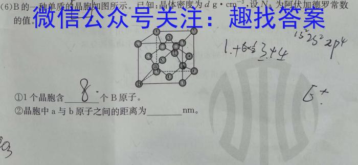 (6)B的一种单质的晶胞如图所示。已知:晶体密度为dgcm^-3,设NA为阿伏加德罗常数的值。①1个晶胞含