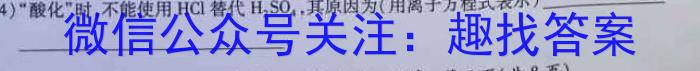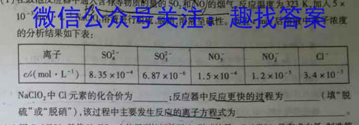 H2SO4,(4)“酸化”时,不能使用HCl替代H,S0,其原因为(用离子方程式表示)HCl。(1)在鼓泡反应器中通人含有等物质的的SO2和NO0的烟气,反应温度为323K,加人10^-3molL^-1NaClO3,溶液进行脱硫,脱硝,溶液呈碱性反应:min后溶液中离子浓度的分析结果如下表:NaClO2中Cl1元素的化合价为;反应器中反应更快的过程为(填硫”或“脱硝”),该过程中主要发生反应的离子方程式为