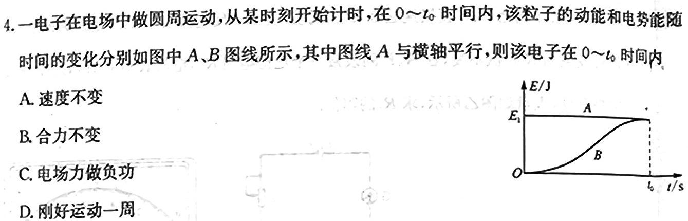 4.一电子在电场中做圆周运动,从某时刻开始计时,在0~时间内,该粒子的动能和电势能随0∼10时间的变化分别如图中A、B图线所示,其中图线A与横轴平行,则该电子在0~l时间内0l0A.速度不变B.合力不变C.电场力做负功D.刚好运动一周