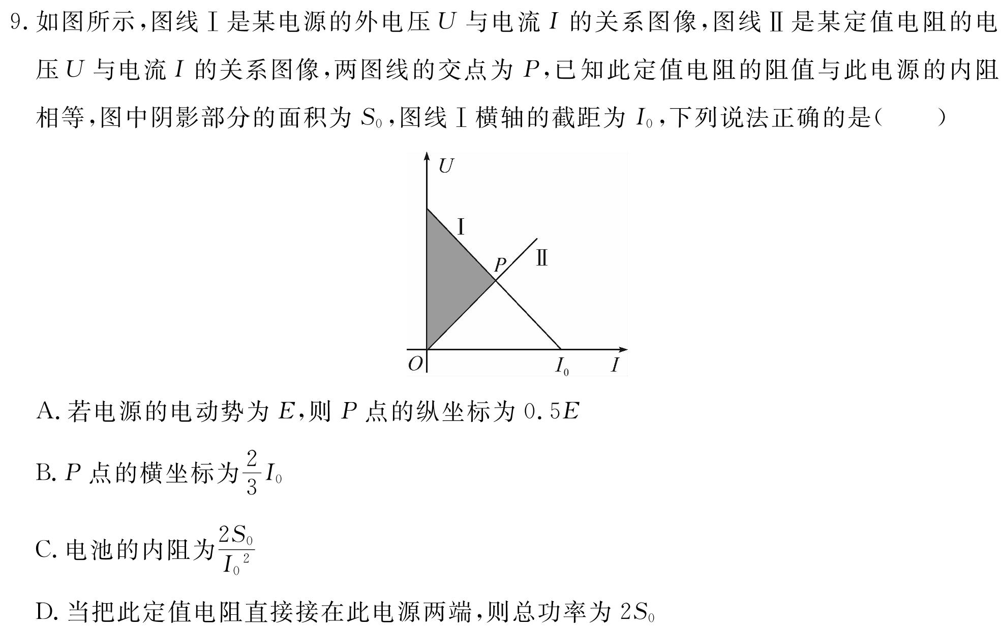 9.如图所示,图线I是某电源的外电压U与电流I的关系图像,图线Ⅱ是某定值电阻的电压U与电流I的关系图像,两图线的交点为P,已知此定值电阻的阻值与此电源的内阻相等,图中阴影部分的面积为S0,图线I横轴的截距为I0,下列说法正确的是()A.若电源的电动势为E,则P点的纵坐标为0.5EB.P点的横坐标为23I0C.电池的内阻为2S0I0^2D.当把此定值电阻直接接在此电源两端,则总功率为2S0