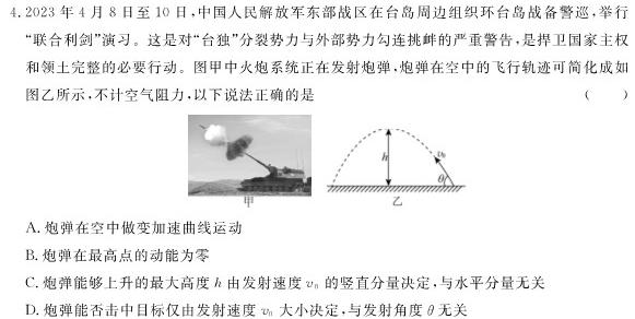 4.2023年4月8日至10日,中国人民解放军东部战区在台岛周边组织环台岛战备警巡,举行“联合利剑”演习。这是对“”分裂势力与外部势力勾连挑衅的严重警告,是捍卫国家主权和领土完整的必要行动。图甲中火炮系统正在发射炮弹,炮弹在空中的飞行轨迹可简化成如图乙所示,不计空气阻力,以下说法正确的是()A.炮弹在空中做变加速曲线运动B.炮弹在最高点的动能为零C.炮弹能够上升的最大高度h由发射速度v0的竖直分量决定,与水平分量无关D.炮弹能否击中目标仅由发射速度v0大小决定,与发射角度0无关