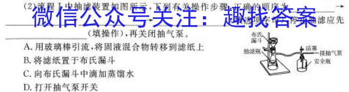 (2)流程I中抽滤装置如图所示,下列有关操作步骤,正确的顺序为→→→(填选(填选项字母),停止抽滤应先(填操作),再关闭抽气泵。A.用玻璃棒引流,将固液混合物转移到滤纸上B.将滤纸置于布氏漏斗C.向布氏漏斗中滴加蒸馏水D.打开抽气泵开关