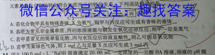 13.认识物质的转化关系能更好地制备物质。某化学学习小组研究发现在合适条件下有多种元素及其化合物的转化符合如图所示的转化关系。下列说法错误的是IckA.若化合物甲具有特殊香味.X为氧气,则甲与丙反应可生成有香味的液体B.若甲为常见非金属单质,丙的浓溶液能与铜发生氧化还原反应,则甲一定是氮气还原反应,则中C.若甲是常见的简单氢化物,丙与水反应后溶液显酸性,则乙可能是氧化物(bD.若甲为黄绿色气体,则2mo1乙与足量X反应可生成3mol丙