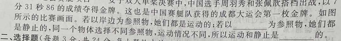 10.成都大运会赛艇项目——女子双人单桨决赛中,中国选手周羽秀和张佩搭档出战,以?分31秒86的成绩夺得金牌。这也是中国赛艇队获得的成都大运会第一枚金牌。如图所示的比赛画面。若以岸边为参照物,她们都是运动的;若以为参照物,她们都是静止的,同一个物体选择不同参照物,运动情况不同,所以运动和静止是的。。