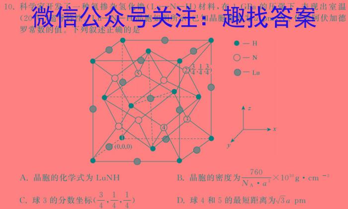 10.科学家开发了一种氮掺杂氢化镨(Lu-N-H))材料,在1GPa的压强下,表现出室温(20^C))超导特性。Lu-N-H晶胞如图所示,已知晶胞参数为apm,NA代表阿伏加德罗常数的值。下列叙述正确的是A.晶胞的化学式为LuNHB.品胞的密度为760NAa^310^30gcm^-3C.球3的分数坐标(34,14,14)D.球4和5的最短距离为3apm