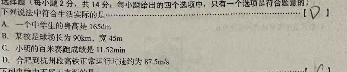二、选择题(每小题2分,共14分;每小题给出的四个选项中,只有一个选项是符合题意的)11.下列说法中符合生活实际的是……………………………………………………………..DA.一个中学生的身高是165dmB.某校足球场长为90km,宽45mC.小明的百米赛跑成绩是11.52minD.合肥到杭州段高铁正常运行时速约为87.5m/s