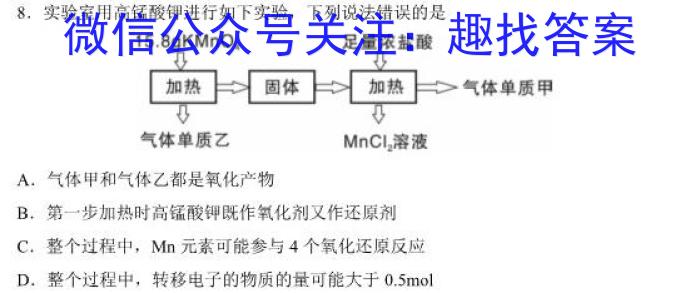 8.实验室用高锰酸钾进行如下实验,下列说法错误的是A.气体甲和气体乙都是氧化产物B.第一步加热时高锰酸钾既作氧化剂又作还原剂C.整个过程中,Mn元素可能参与4个氧化还原反应D.整个过程中,转移电子的物质的量可能大于0.5mol