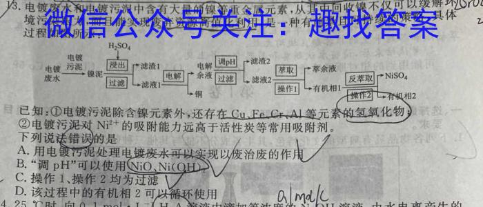 除去乙烯中的CO213.电镀废水和电镀污泥中含有大量的镍等重金属元素,从其中回收镍不仅可以缓解环以缓解环2004+境污染压力,而且能实现废弃资源高值化利用,是一种有前景且可持续的策略,具体214过程如图所示:H2SO4目已知:①电镀污泥除含镍元素外,还存在Cu、Fe、Cr、Al等元素的氢氧化物;②电镀污泥对Ni^2+的吸附能力远高于活性炭等常用吸附剂。下列说法错误的是A.用电镀污泥处理电镀废水可以实现以废治废的作用B.“调pH”可以使用Cu2O、Ni(OH)C.操作1、操作2均为过滤D.该过程中的有机相2可以循环使用a.mal