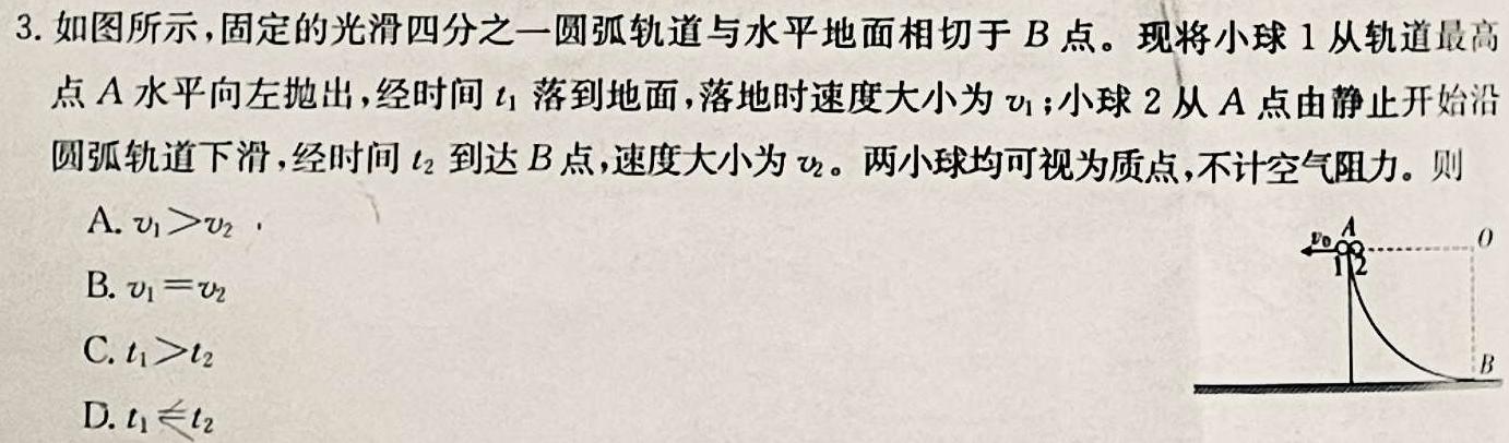 3.如图所示,固定的光滑四分之一圆弧轨道与水平地面相切于B点。现将小球1从轨道最高点A水平向左抛出,经时间t1落到地面,落地时速度大小为v1;小球2从A点由静止开始沿圆弧轨道下滑,经时间t2到达B点,速度大小为v2。,两小球均可视为质点,不计空气阻力。则A.v1>v2,B.v1=v2C.t1>t2D.t1t2