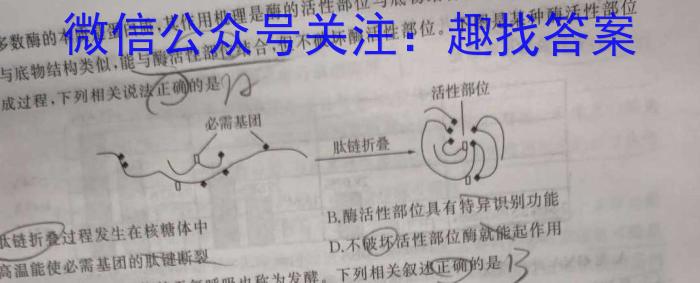 制剂与底物结构类似,能与酶活性部位结合,但不破坏酶活性部位。下图是某种酶活性部位的形成过程,下列相关说法正确的是9日活性部位必需基团肽链折叠A:肽链折叠过程发生在核糖体中B.酶活性部位具有特异识别功能C.高温能使必需基团的肽键断裂D.不破坏活性部位酶就能起作用