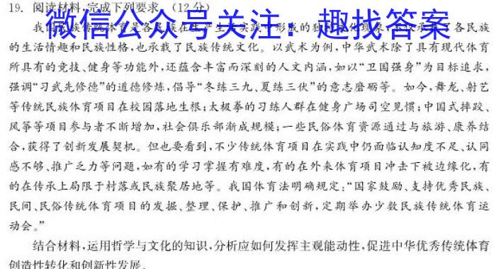19.阅读材料,完成下列要求。(12分)我国民族传统体育是各民族在生产生活实践中形成的独特文化现象,不仅承载了各民族的生活情趣和民族性格,也承载了民族传统文化。以武术为例,中华武术除了具有现代体育所具有的竞技、健身等功能外,还蕴含丰富而深刻的人文内涵,如以“卫国强身”为目标追求,强调“习武先修德”的道德修炼,倡导“冬练三九、夏练三伏”的意志磨砺等。如今,舞龙、射艺等传统民族体育项目在校园落地生根;太极拳的习练人群在健身广场司空见惯;中国式摔跤、风筝等项目参与者不断增加,社会俱乐部渐成规模;一些民俗体育资源通过与旅游、康养结合,获得了创新发展契机。但也要看到,不少传统体育项目在实践中仍面临认知度不足、认同感不够、推广乏力等问题,如有的学习掌握有难度,有的在外来体育项目冲击下被边缘化,有的在传承上局限于村落或民族聚居地等。我国体育法明确规定:“国家鼓励、支持优秀民族、民间、民俗传统体育项目的发据、整理、保护、推广和创新,定期举办少数民族传统体育运动会。”结合材料,运用哲学与文化的知识,分析应如何发挥主观能动性,促进中华优秀传统体育创造性转化和创新性发展。