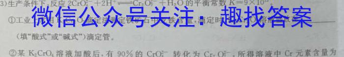 (3)生产条件下,反应2CrO4^2-+2H^+Cr2O7^2-+H2O的平衡常数K=910^13①T[业上常用K2Cr2O7滴定法测定铁矿石中亚铁含量,滴定时,K2Cr2O7溶液盛放在(填“酸式”或“碱式”)滴定管。