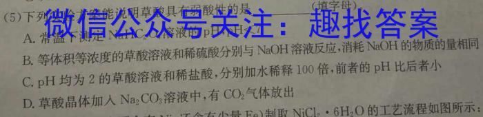 (5)下列实验方案能说明草酸具有弱酸性的是(填字母)。A.常温下测定NaHC2O4溶液的pH,pH<7B.等体积等浓度的草酸溶液和稀硫酸分别与NaOH溶液反应,消耗NaOH的物质的量相同C.pH均为2的草酸溶液和稀盐酸,分别加水稀释100倍,前者的pH比后者小D.草酸晶体加人Na2CO3溶液中,有CO2气体放出的工艺流程如图所示: