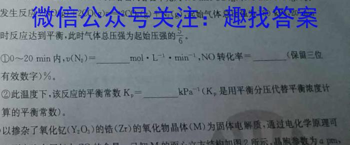 的恒容密闭容器中充入0.3molCO(g)、0.3molNO(g),,仅,起始气体总压强为(3)一定温度下,起始时向2L发生反应2NO(g)+2CO(g)2CO2(g)+N2(g)180kPa,20min时反应达到平衡,此时气体总压强为起始压强的56。molL^-1^-1,NO转化率=(保留三位①020min内,v(N2)=②此温度下,该反应的平衡常数有效数字)%。是用平衡分压代替平衡浓度计Kp=kPa^-1(Kp算的平衡常数)。)的锆(Zr)的氧化物晶体(M)为固体电解质,通过电化学原理可