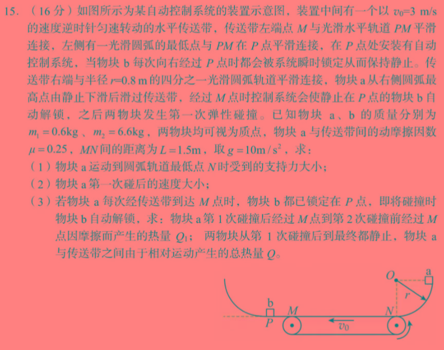 15.(16分)如图所示为某自动控制系统的装置示意图,装置中间有一个以v0=3m/s的速度逆时针匀速转动的水平传送带,传送带左端点M与光滑水平轨道PM平滑连接,左侧有一光滑圆弧的最低点与PM在P点平滑连接,在P点处安装有自动控制系统,当物块b每次向右经过P点时都会被系统瞬时锁定从而保持静止。传送带右端与半径r=0.8m的四分之一光滑圆弧轨道平滑连接,物块a从右侧圆弧最高点由静止下滑后滑过传送带,经过M点时控制系统会使静止在P点的物块b自动解锁,之后两物块发生第一次弹性碰撞。已知物块a、b的质量分别为m1=0.6kg、m2=6.6kg,,两物块均可视为质点,物块a与传送带间的动摩擦因数=0.25,MN间的距离为L=1.5m,,取g=10m/s^2,,求:(1)物块a运动到圆弧轨道最低点N时受到的支持力大小;(2)物块a第一次碰后的速度大小;(3)若物块a每次经传送带到达M点时,物块b都已锁定在P点,即将碰撞时物块b自动解锁,求:物块:a第1次碰撞后经过M点到第2次碰撞前经过M点因摩擦而产生的热量Q1;;两物块从第1次碰撞后到最终都静止,物块a与传送带之间由于相对运动产生的总热量0。
