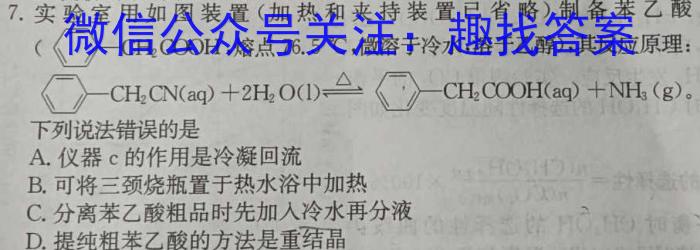 7.实验室用如图装置(加热和夹持装置已省略)制备苯乙酸(CH2COOH,熔点76.5^C,,微溶于冷水,溶于乙醇),其反应原理:CH2CN(aq)+2H2O(l)CH2COOH(aq)+NH3(g)。下列说法错误的是A.仪器c的作用是冷凝回流B.可将三颈烧瓶置于热水浴中加热C.分离苯乙酸粗品时先加人冷水再分液D.提纯粗苯乙酸的方法是重结晶