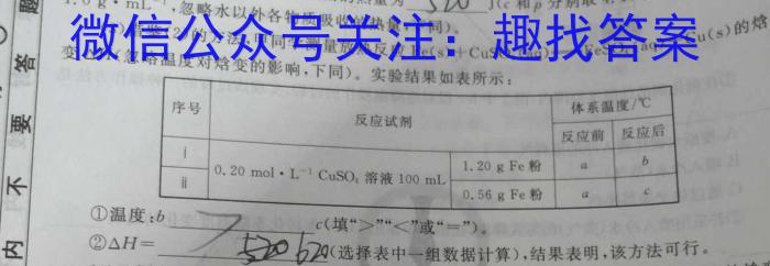 (3)忽略水以外各物质吸收的热量,下同)。(3)借鉴(2)的方法,甲同学测量放热反应Fe(s)+CuSO.(aq)——FeSO.(aq)+Cu(s)的焓Fe(s)+CuSO4(aq)FeSO4(aq)+Cu(s)s)△H变△H(忽略温度对焓变的影响,下同)。实验结果如表所示:+CuSO.(aq)①温度::bc(填“”“<”或“一”)。②△H=620((选择表中一组数据计算),结果表明,该方法可行。