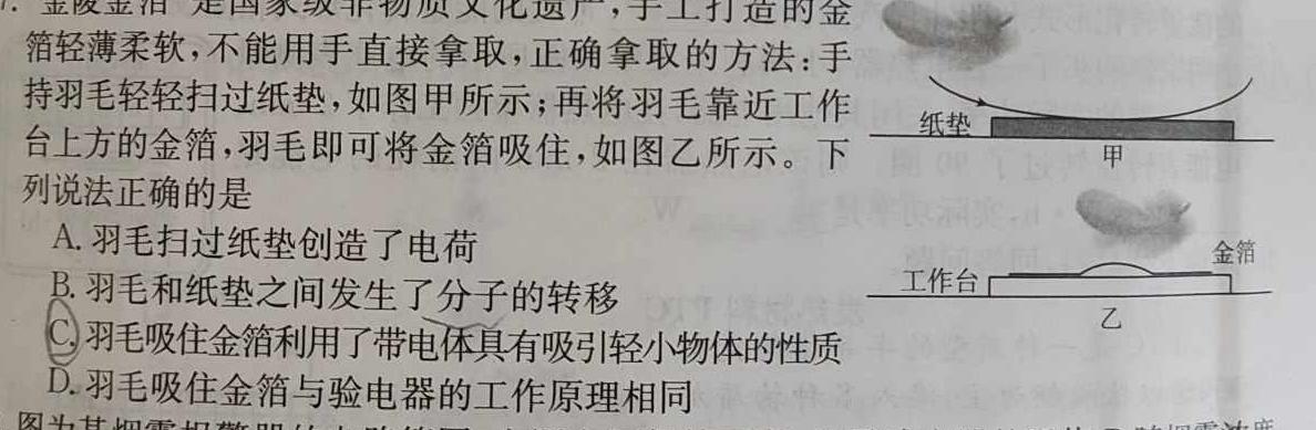 7.“金陵金箔”是国家级非物质文化遗产,手工打造的金箔轻薄柔软,不能用手直接拿取,正确拿取的方法:手持羽毛轻轻扫过纸垫,如图甲所示;再将羽毛靠近工作台上方的金箔,羽毛即可将金箔吸住,如图乙所示。下列说法正确的是纸垫甲A.羽毛扫过纸垫创造了电荷B.羽毛和纸垫之间发生了分子的转移C羽毛吸住金箔利用了带电体具有吸引轻小物体的性质D.羽毛吸住金箔与验电器的工作原理相同金箔工作台乙