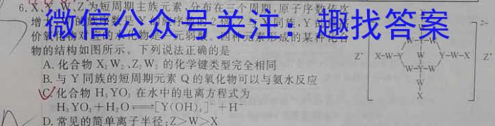 6..、Y、W、Z为短周期主族元素,分布在三个周期,原子序数依次增大,W的族序数是Y的族序数的2倍,Z与X同族,的最高价氧化物对应的水化物是一元弱酸、四种元素形成的某种化合物的结构如图所示,下列说法正确的是A.化合物X2W2、Z2W2的化学键类型完全相同B.与Y同族的短周期元素Q的氧化物可以与氨水反应化合物H3YO3在水中的电离方程式为H2YO3+H2O[Y(OH)4]+HD.常见的简单离子半径:Z>W>X