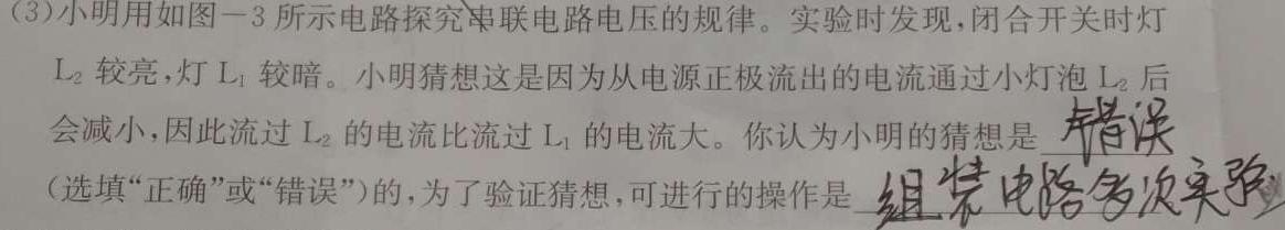 (3)小明用如图一3所示电路探究串联电路电压的规律。实验时发现,闭合开关时灯L2较亮,灯L1较暗。小明猜想这是因为从电源正极流出的电流通过小灯泡L2后会减小,因此流过L2的电流比流过L1的电流大。你认为小明的猜想是错误(选填“正确”或“错误”)的,为了验证猜想,可进行的操作是组装电路多次实验