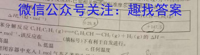 (1)标准状态时,由指定果质生成1mol物质的焓变称为标准摩尔生成焓,如氨气的标准摩Hm(NH3,g)尔生成焓可用H(NH,g)表示。规定△H(C,石墨)和△H(H2,g)为0,利用标准H10(C,1H2^6(H2,g)0,摩尔生成焓可以求出化学反应热,已知相关物质的标准摩尔生成焓如下表:乙苯分解反应CHCHs(g)—C,HCH-CH(g)+H(g)的AH=C5H5C2H5(g)C6H5CH=CH2(g)+H2(g)△H=kJmol^-1,,该反应在(填标号)下有利于自发进行。