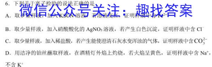 6.下列关于离子检验的说法正确的是A.取少量样液,加入KSCN溶液,若溶液变红,证明样液中含Fe^2+B.取少量样液,加入硝酸酸化的AgNO3溶液,若产生白色沉淀,证明样液中含Cl^-C.取少量样液,加入稀盐酸,若产生能使澄清石灰水变浑浊的气体,证明样液中含CO3^2-D.用洁净的铂丝蘸取样液,在酒精灯外焰上灼烧,若火焰呈黄色,证明样液中含Na^+,不含K^+