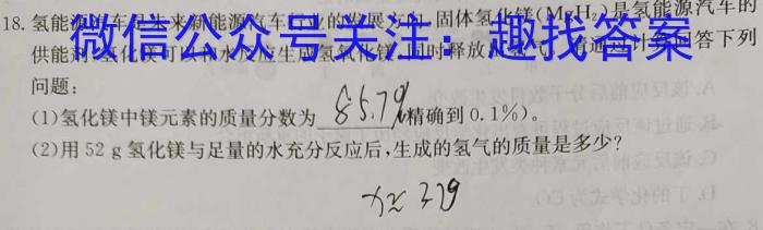 (MgH2)18.氢能源汽车是未来新能源汽车行业的发展方向,固体氢化镁(MgH)是氢能源汽车的供能剂,氢化镁可以和水反应生成氢氧化镁,同时释放出氢气。请通过计算回答下列问题:85.7%(1)氢化镁中镁元素的质量分数为精确到0.1%)。(2)用52g氢化镁与足量的水充分反应后,生成的氢气的质量是多少?x≈379