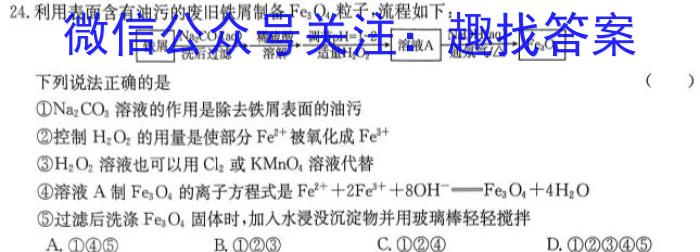 24.利用表面含有油污的废旧铁屑制备Fe3O4粒子,流程如下:下列说法正确的是()1Na2CO3溶液的作用是除去铁屑表面的油污②控制H2O2的用量是使部分Fe^2+被氧化成Fe^3+3H2O2溶液也可以用Cl2或KMnO4溶液代替④溶液A制Fe3O4的离子方程式是Fe^2++2Fe^3++8OH^-Fe3O4+4H2O⑤过滤后洗涤Fe3O4固体时,加入水浸没沉淀物并用玻璃棒轻轻搅拌A.①④⑤B.①②③C.①②④D.①②③④⑤