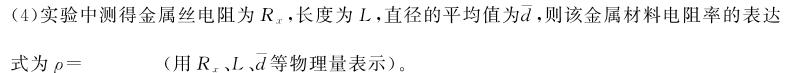 (4)实验中测得金属丝电阻为Rx,长度为L,,直径的平均值为d,则该金属材料电阻率的表达式为ρ=(用Rx、L、d等物理量表示)。(1)下列说法正确的是。(多选)A.小球a的质量一定要大于小球b的质量B.弹簧发射器的内接触面及桌面一定要光滑C.步骤②③中入射小球a的释放点位置一定相同D.把小球轻放在桌面右边缘,观察小球是否滚动来检测桌面右边缘末端是否水平