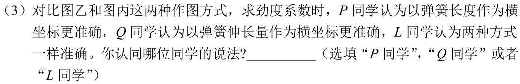 (3)对比图乙和图丙这两种作图方式,求劲度系数时,P同学认为以弹簧长度作为横坐标更准确,Ω同学认为以弹簧伸长量作为横坐标更准确,L同学认为两种方式一样准确。你认同哪位同学的说法?(选填“P同学”,“◎同学”或者“L同学”)