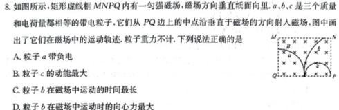 8.如图所示,矩形虚线框MNPQ内有一匀强磁场,磁场方向垂直纸面向里.a、b,c是三个质量和电荷量都相等的带电粒子,它们从PQ边上的中点沿垂直于磁场的方向射人磁场,图中画出了它们在磁场中的运动轨迹.粒子重力不计.下列说法正确的是A.粒子a带负电B.粒子c的动能最大C.粒子b在磁场中运动的时间最长D.粒子b在磁场中运动时的向心力最大